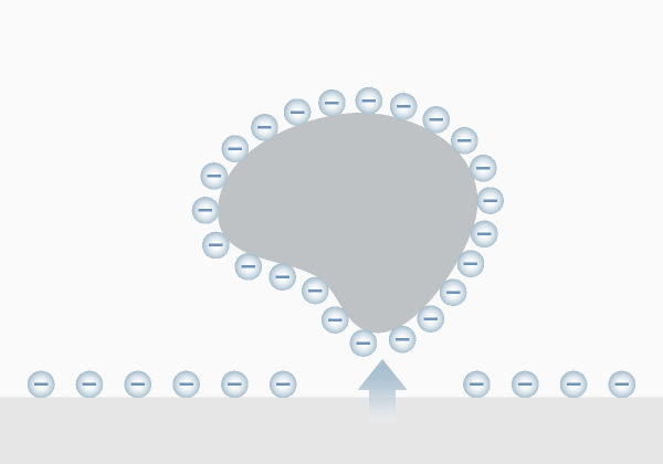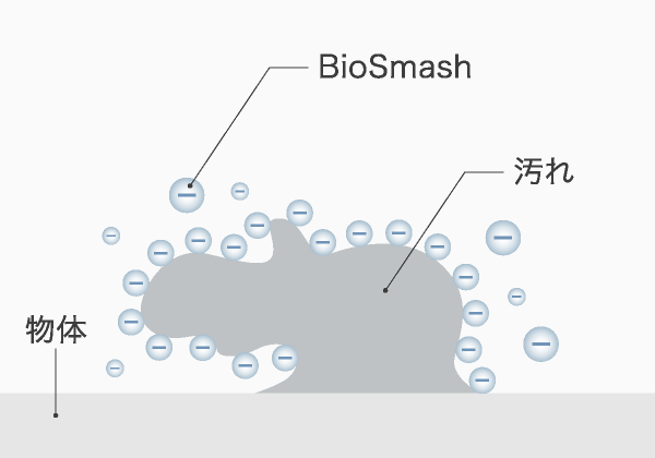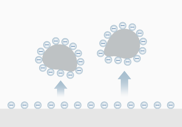 同時に汚れや物体をマイナスイオン化し、お互いに反発するように剥離・分散します。